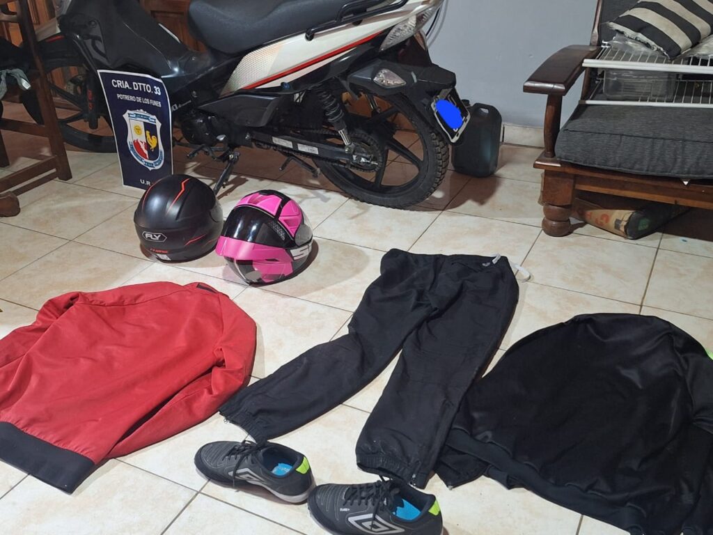 Uno de los procedimientos se realizó en una vivienda de calle Bolívar al 1100, donde reside un joven de 21 años, y donde se procedió al secuestro de una motocicleta marca Honda, modelo Titan, de color negro con dorado, además de cascos y prendas de vestir de interés para la causa.