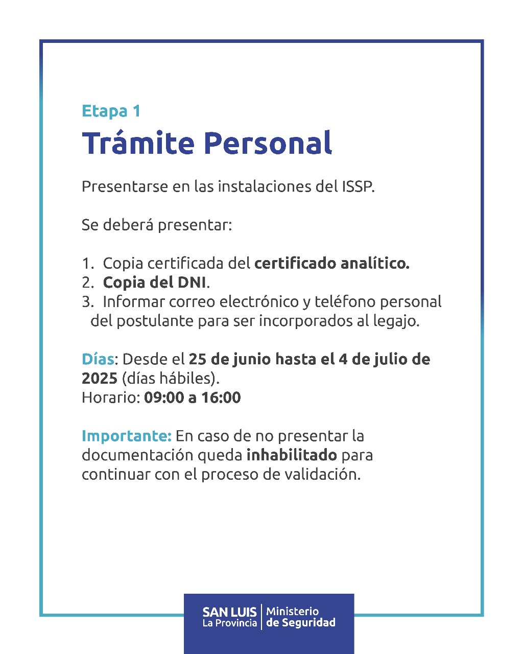 Además, se recuerda que quienes retiraron su legajo durante la pausa del ciclo 2024 pueden reincorporarlo para continuar el proceso. Y se aclaró que no podrá ingresar ninguna persona con antecedentes penales, lo cual será verificado a nivel provincial y nacional.