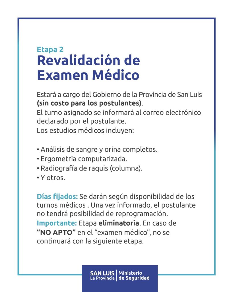 El Gobierno provincial informó que continuará con la siguiente etapa del proceso de ingreso para las carreras de agente de policía y subayudante penitenciario. Ahora se realizará la revalidación de exámenes médicos, que incluirá análisis completos, ergometría y evaluación de columna, costeados por el Estado.