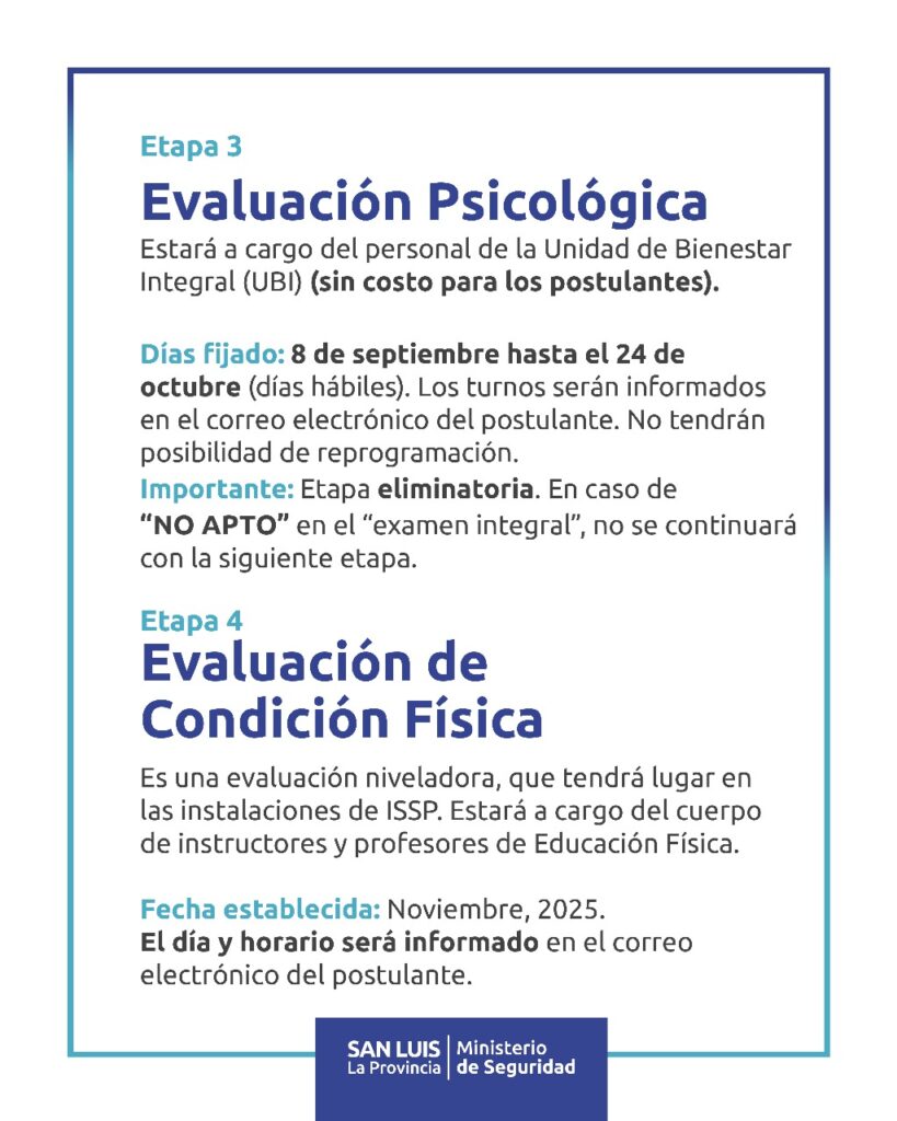 Quienes resulten aptos seguirán a la tercera etapa, la evaluación psicológica integral, a cargo de profesionales de la Unidad de Bienestar Integral (UBI). Esta instancia será presencial, entre el 8 de septiembre y el 24 de octubre.