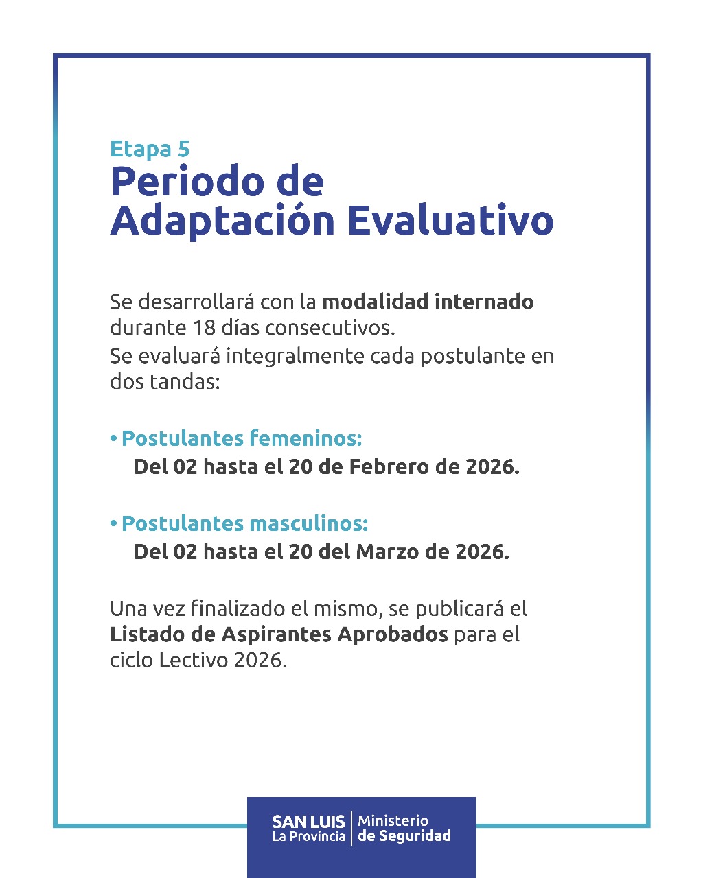 La última instancia será el periodo de adaptación evaluativo, tipo internado: del 2 al 20 de febrero de 2026 para mujeres y del 2 al 20 de marzo para varones. Será clave para confirmar la vocación del postulante.