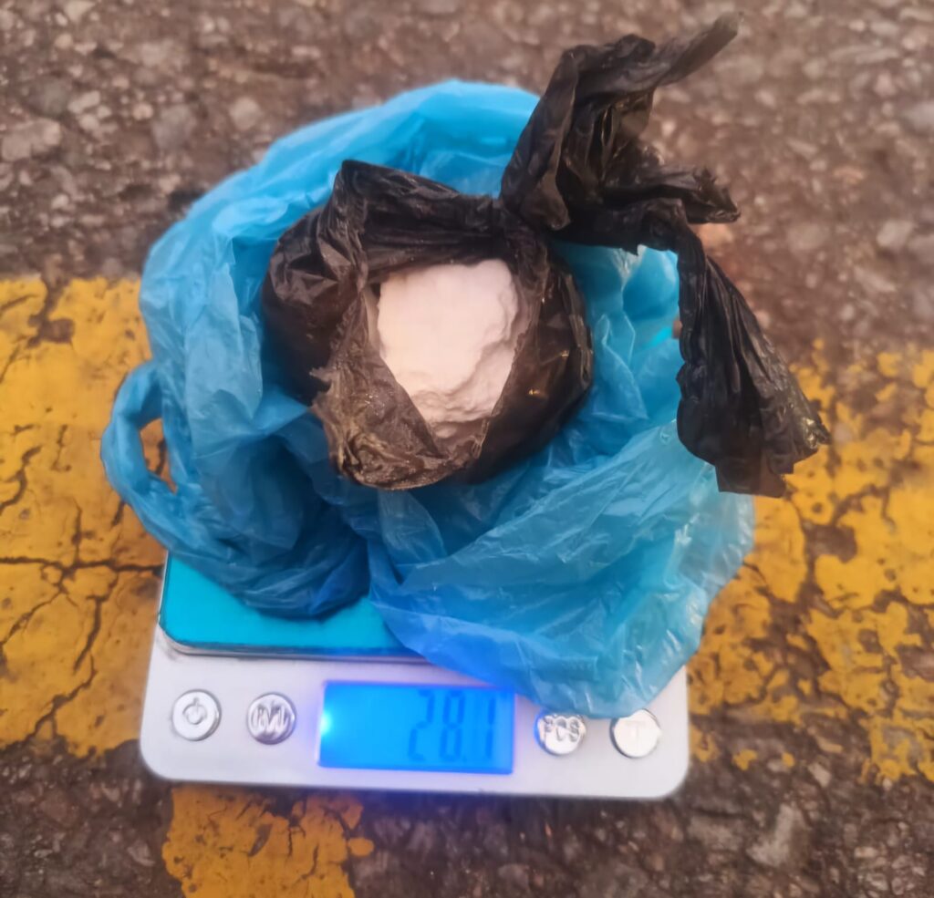 Durante la requisa al conductor, se secuestró una bola de nylon celeste tipo camiseta, que contenía un envoltorio interno de nylon negro con una sustancia blanquecina compacta, similar a la cocaína. El pesaje arrojó un total de 28,1 gramos, cantidad suficiente para elaborar aproximadamente 112 dosis, con un valor estimado de $562.000 pesos argentinos en el mercado ilegal.
