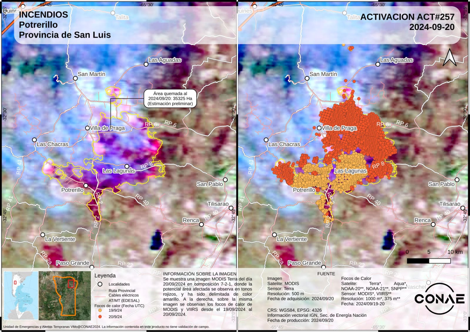 La Unidad de Emergencias y Alerta Temprana de la Comisión Nacional de Actividades Espaciales (CONAE) reportó un crecimiento extraordinario de las zonas quemadas en el departamento San Martín, a pesar del enorme esfuerzo que valientemente despliegan los bomberos y todo el personal de Seguridad y Defensa Civil de la Provincia de San Luis. La segunda alerta del organismo que llegó a la Secretaría de Ambiente y Desarrollo Sustentable señala que son 35.325 las hectáreas las afectadas por los focos ígneos hasta este saábado. Ayer el reporte mencionó que eran 5000, lo que representa un crecimiento descomunal favorecido por las condiciones climáticas y las pasturas secas.