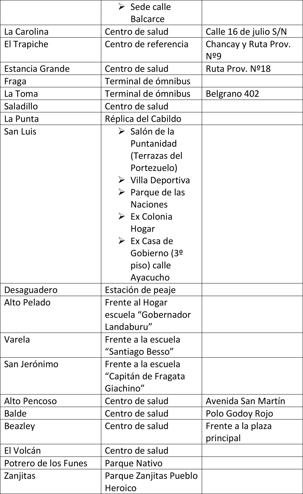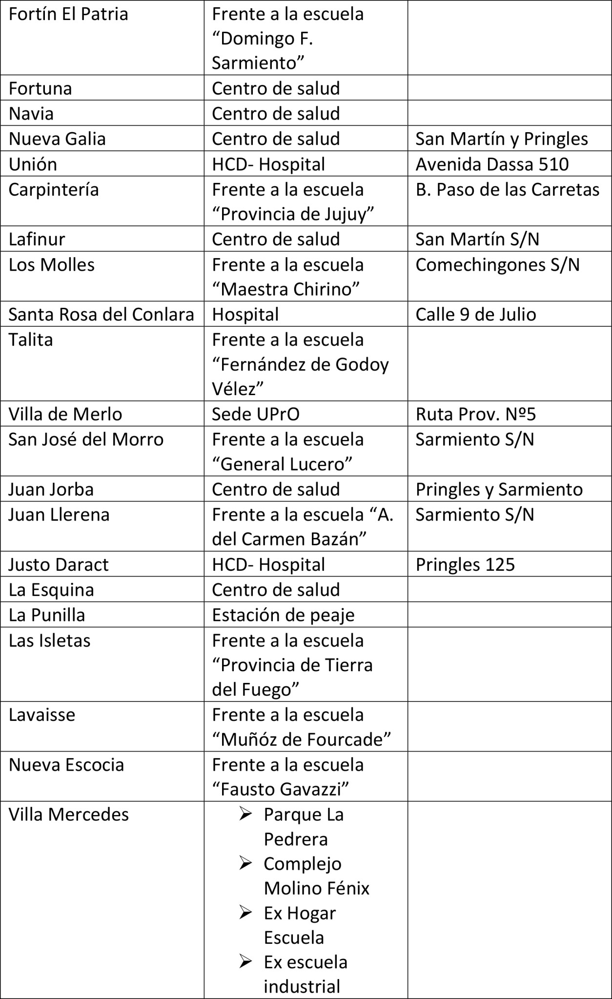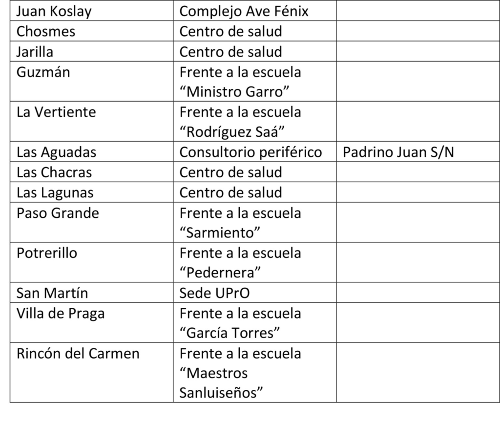 Los lugares dispuestos para el operativo son: