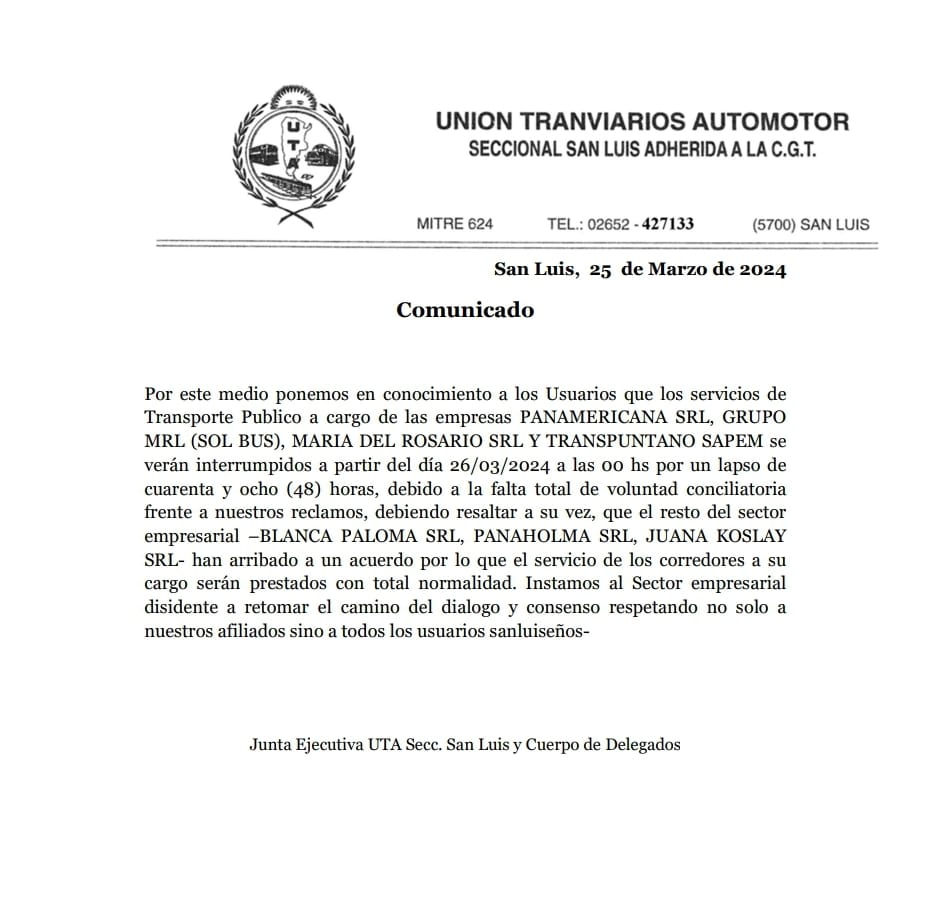 La Unión Tranviarios Automotor detallo en un comunicado como será acatado el paro en San Luis