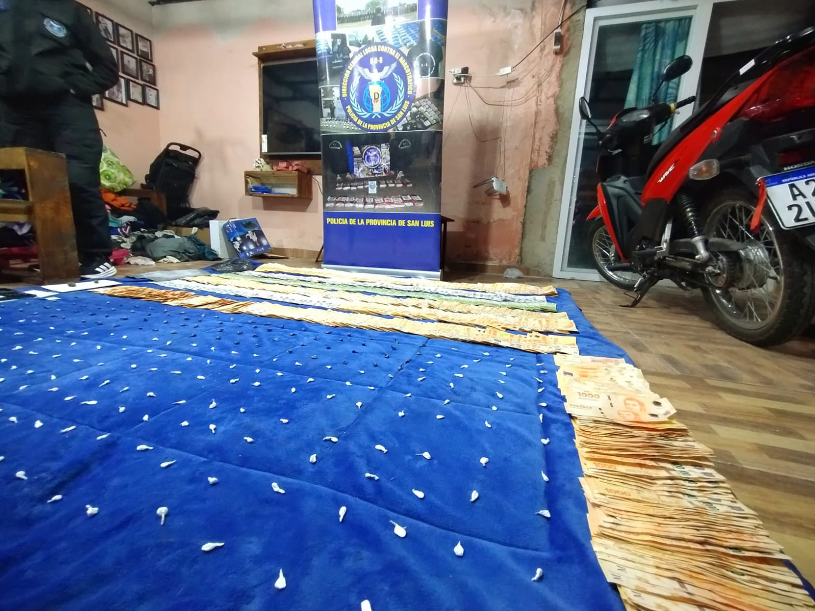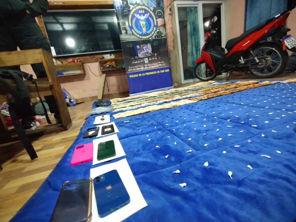 Además, se incautaron tres florescencias y una planta de cannabis sativa de aproximadamente 17 centímetros de altura, tres teléfonos celulares, la suma de $1.663.000 pesos argentinos en efectivo, varios recortes de nylon utilizados para el fraccionamiento de la droga y una motocicleta marca Honda, modelo Wave 110cc.
