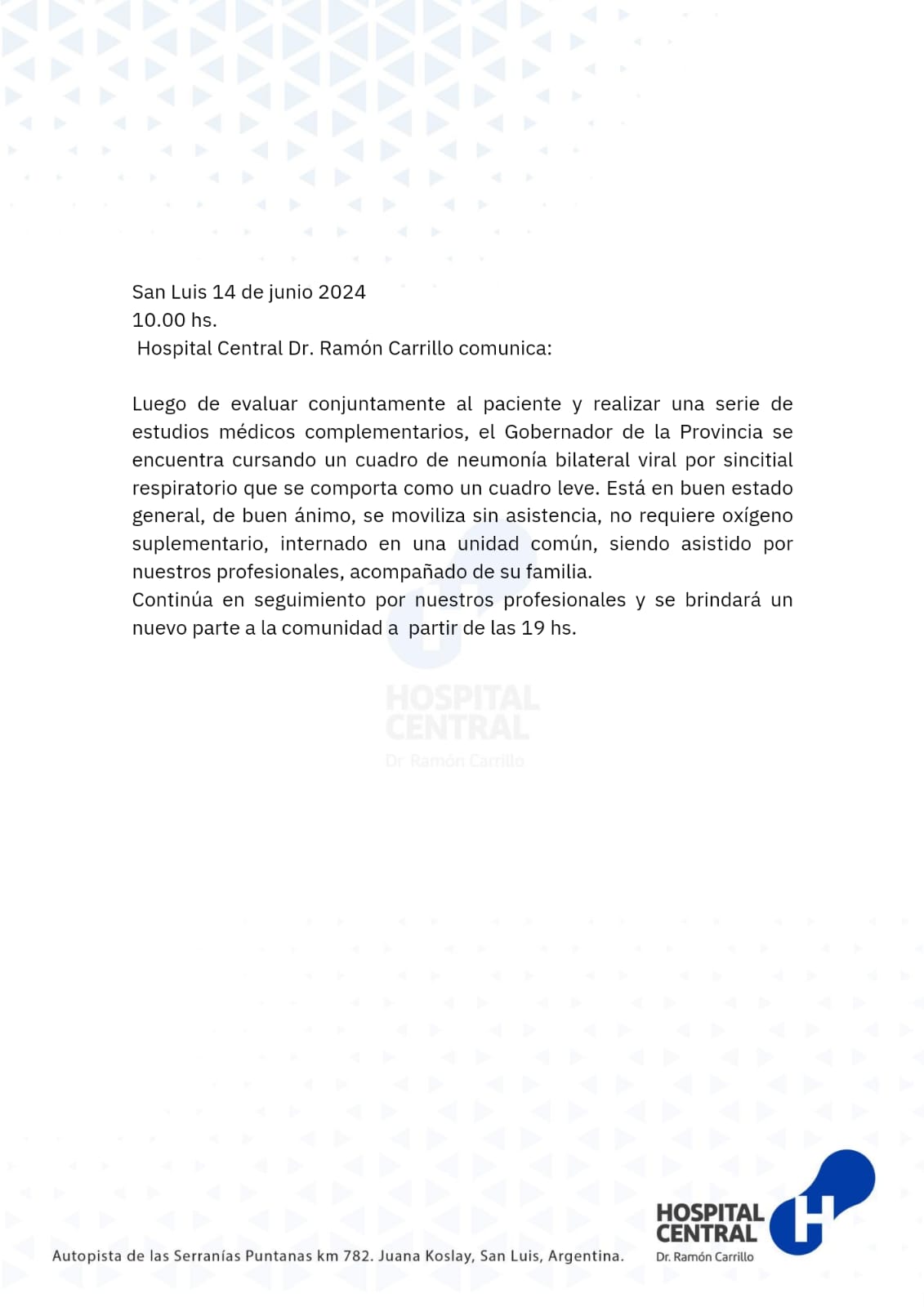 Hace instantes desde el Hospital Central Ramón Carrillo se puso a disposición el primer parte médico sobre la salud del Gobernador.