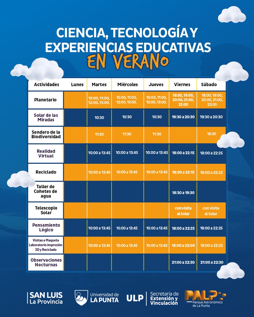 Este verano la ciencia vuelve a ganar protagonismo, el Parque Astronómico de La Punta (PALP), dependiente de la Universidad de La Punta (ULP), se prepara para recibir a turistas y residentes con una propuesta que combina astronomía, tecnología y naturaleza. La temporada comienza el 5 de enero y se extenderá hasta el 14 de febrero, con actividades gratuitas y abiertas a todo público. La agenda se desarrollará de martes a jueves, de 9:00 a 14:00 y viernes y sábados, de 18:00 a 22:45. La idea es que los visitantes puedan elegir entre experiencias diurnas y nocturnas.