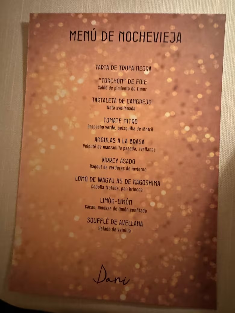 El expresidente recibió el 2024 en el restaurante Dani, del Hotel Four Seasons, en la capital española; siguió la tradición de comer las uvas a las 12; el menú costaba 600 euros sin vino.