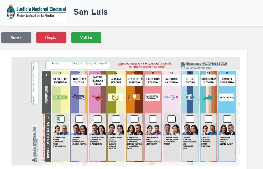 En el simulador, el usuario debe seleccionar su distrito —en este caso, San Luis, que renovará tres bancas de Diputados— y podrá practicar la marcación de su preferencia. En caso de cometer errores, el sistema emite advertencias: si se marcan dos fuerzas políticas, el voto es nulo, al igual que si se marca fuera del casillero correspondiente. La herramienta permite limpiar la boleta y volver a intentarlo hasta obtener un voto válido.