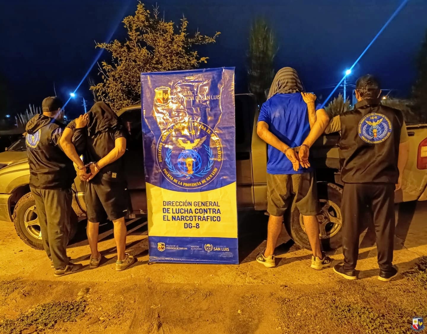 Los policías de Lucha Contra el Narcotráfico acudieron a ese sitio ya que efectivos de la Dirección General de Policía Caminera y Seguridad Vial habían retenido una camioneta Chevrolet S10 en la que viajaban dos hombres de 42 y 44 años de edad (ambos con domicilio en Villa Mercedes y uno de ellos oriundo de Coronel Moldes, provincia de Córdoba).