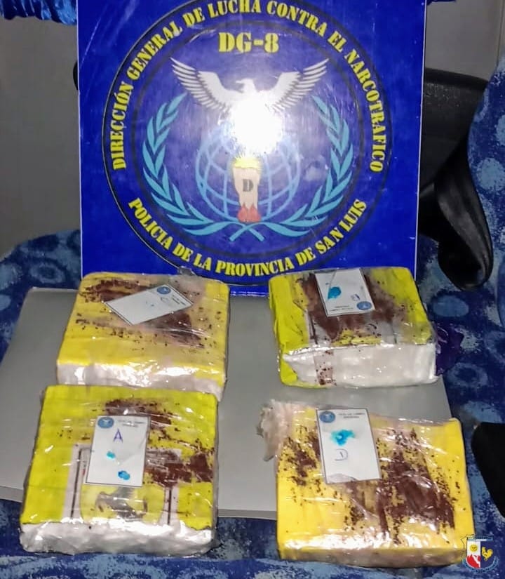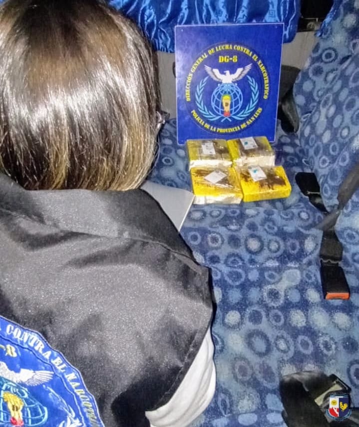 En ese sentido, se hizo un monitoreo del ómnibus -además de mantener comunicación con los choferes- y al llegar a la terminal de San Luis se llevó a cabo el procedimiento mediante el cual personal de Lucha Contra el Narcotráfico incautó cuatro envoltorios que en su interior contenían cocaína. Los mismos estaban en el portaequipaje ubicado en el primer piso del colectivo.