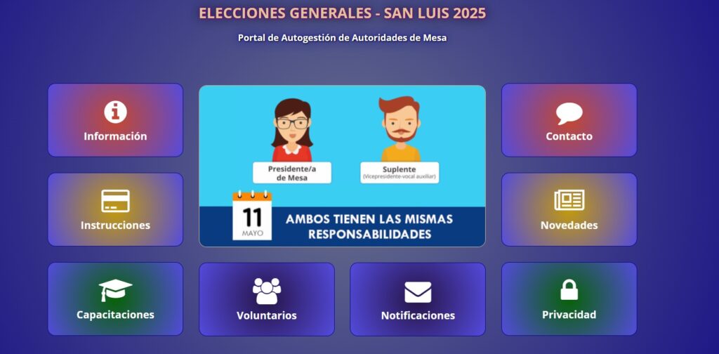 La Secretaría Electoral de la provincia de San Luis informa que ya se encuentra habilitado el portal web de Autogestión de Presidentes de Mesa, a fin de que las personas interesadas en cubrir funciones como Autoridades de Mesa, puedan registrarse como voluntarios para actuar en las elecciones provinciales del próximo 11 de mayo.