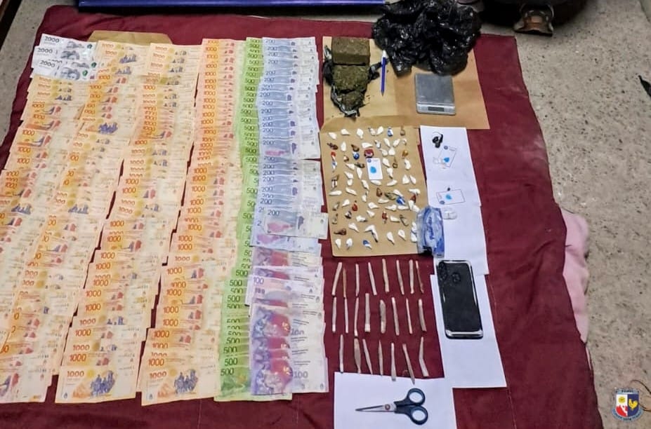 En el lugar se secuestraron e incautaron 81 envoltorios de nylon con cocaína, 23 cigarrillos armados caseros de marihuana, dos trozos de marihuana compactada, $193.000 en efectivo, una balanza digital, un teléfono celular, entre otros elementos.