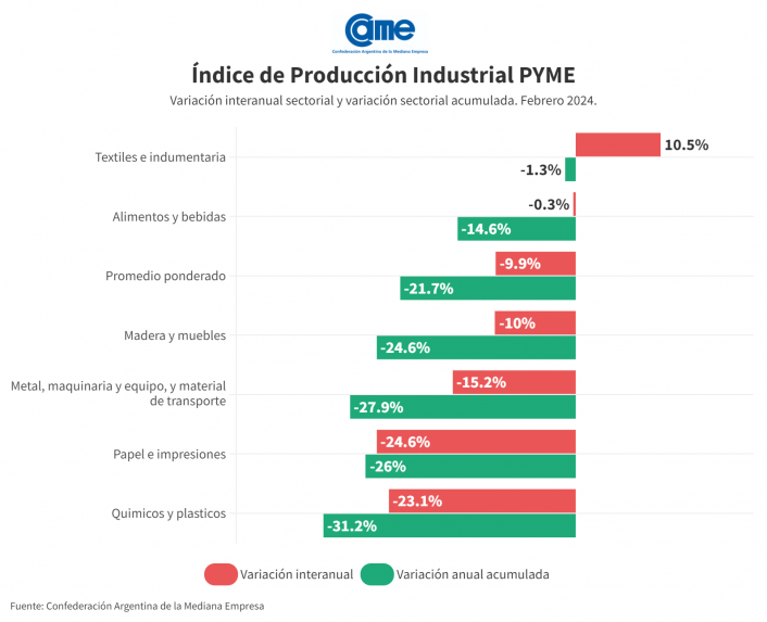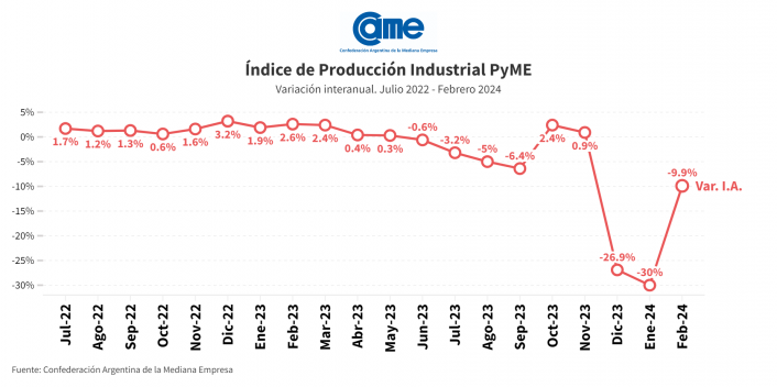 La industria manufacturera pyme se retrajo 9,9% en febrero frente al mismo mes del año pasado, a precios constantes. Es el tercer mes consecutivo en que la actividad fabril cae, aunque aminoró la tasa luego de haberse retraído entre 27% y 30% en diciembre y enero, respectivamente. En la comparación mensual, desestacionalizada, también se registró un descenso de 7,7% y en el acumulado del año la actividad cae 21,7%.