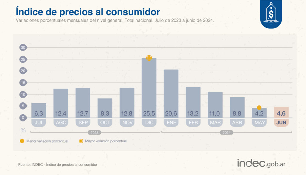 La inflación de junio fue del 4,6% y acumuló 79,8% en los primeros seis meses de 2024, informó este viernes el INDEC. La variación mensual mostró una aceleración de 0,4 puntos contra mayo (4,2%).