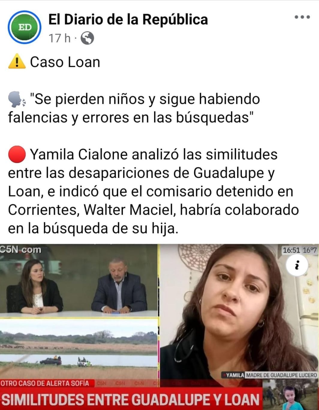 Fue la misma madre de Guadalupe quien dijo en su Facebook, “BUEN DIA! a tantos comentarios msj y publicaciones que veo … Tengo q salir a anunciar que … En base al caso de Loan y del comisario detenido. Publicaré el comunicado desde una persona allegada a SIFEBU… Yo misma Consulte sobre eso q se dice del tal comisario y eso me respondieron…. «Nos llegó el comentario hace unos días y lo chequeamos con la poli de san Luis, a nadie le suena. SI ubiera sido así les sonaría por lo escandaloso. Lo que es muy raro es que de una policia provincial pueda ser transferido a otra, suena improbable, cada provincia tiene su cuerpo policial y es ajeno a las policias de otras provincias. » . Gerardo Nicolás Orengo”