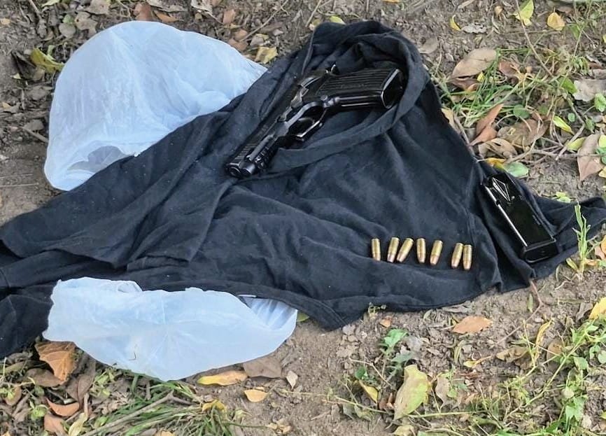 Continuando con las tareas investigativas, los efectivos inspeccionaron zonas aledañas al domicilio allanado. En un sector compuesto por terrenos baldíos y viviendas deshabitadas, localizaron una bolsa oculta entre un árbol y un cerco, que contenía una pistola Bersa TPR9 calibre 9×19 mm con su cargador y siete municiones, envuelta en una remera.