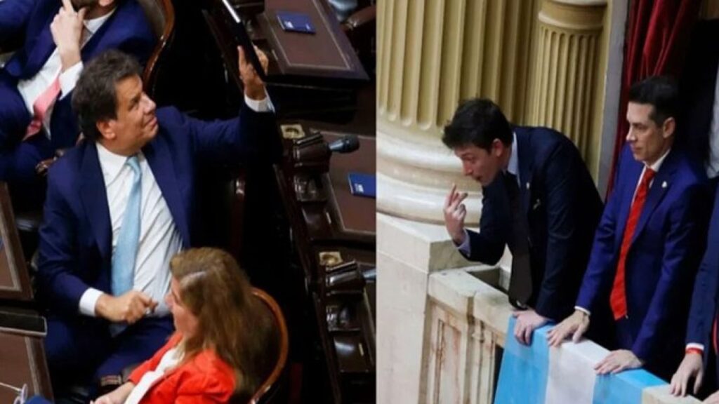 Terminado el discurso, en medio de los gritos militantes, Manes dejó su banca y mientras lo hacía le mostró un ejemplar de la Constitución a Santiago Caputo. El asesor de Milei luego lo fue a buscar a una escalera del Congreso donde se produjo un tenso cruce entre ambos.