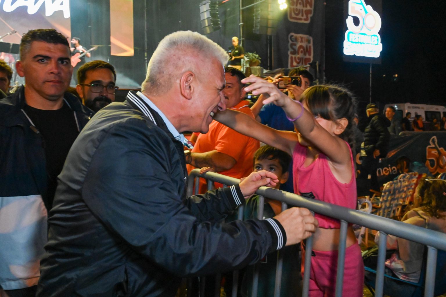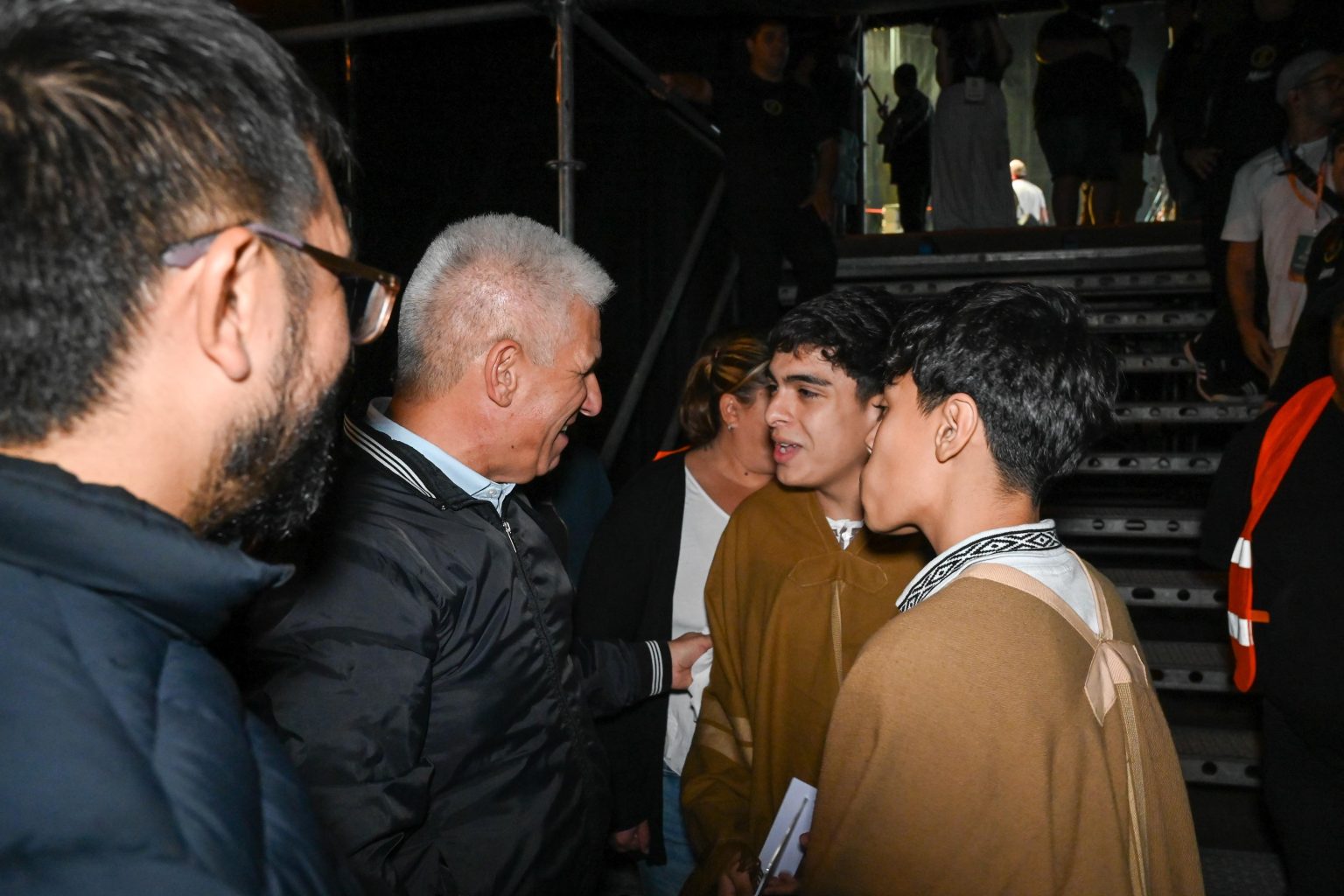 Al atravesar el costado del escenario para integrarse al público, los integrantes del grupo La Cautana lo saludaron e invitaron a los presentes a entonar el tradicional “grito cuyano”. Luego, el Gobernador dialogó con los asistentes y accedió a tomarse fotografías con los presentes.