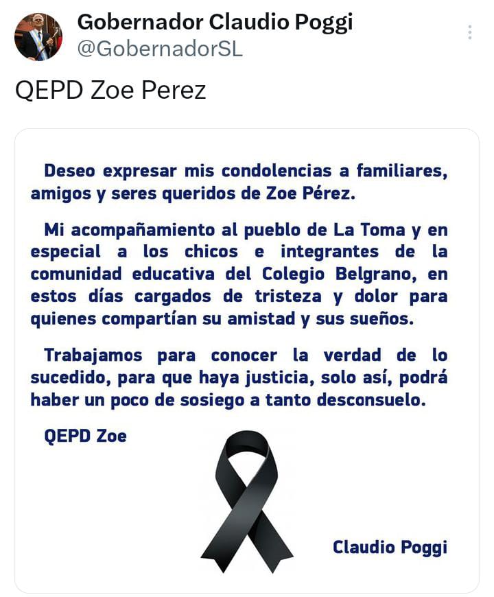 “Deseo expresar mis condolencias a familiares, amigos y seres queridos de Zoe Pérez.