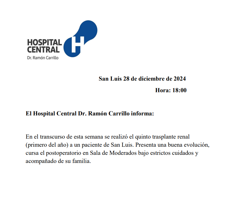 Desde el Hospital Central ‘Ramón Carrillo’ informaron que durante el transcurso de la semana se realizó el quinto trasplante de riñón, y primero del año 2025, por los médicos de esta institución a un paciente en lista de espera de San Luis. El comunicado oficial.