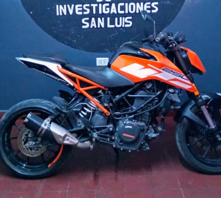 Este miércoles 3 de septiembre, efectivos del Departamento de Investigaciones San Luis recuperaron una motocicleta KTM 250 Duke, valuada en 5.000 dólares, que tenía pedido de secuestro activo por robo desde el 5 de julio de 2024 en la provincia de Buenos Aires.