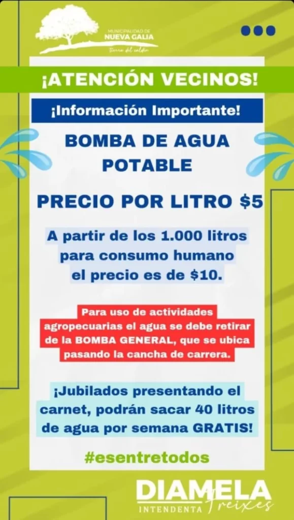 En la historia que compartió Diamela y que fue publicada por el medio El Chorrillero explicó que comprando en la bomba de agua potable el litro sale $5 y que para consumo humano a partir de los 1.000 litros cuesta $10. En la promo se beneficia a los jubilados que podrán obtener hasta 40 litros semanales de manera gratuita.