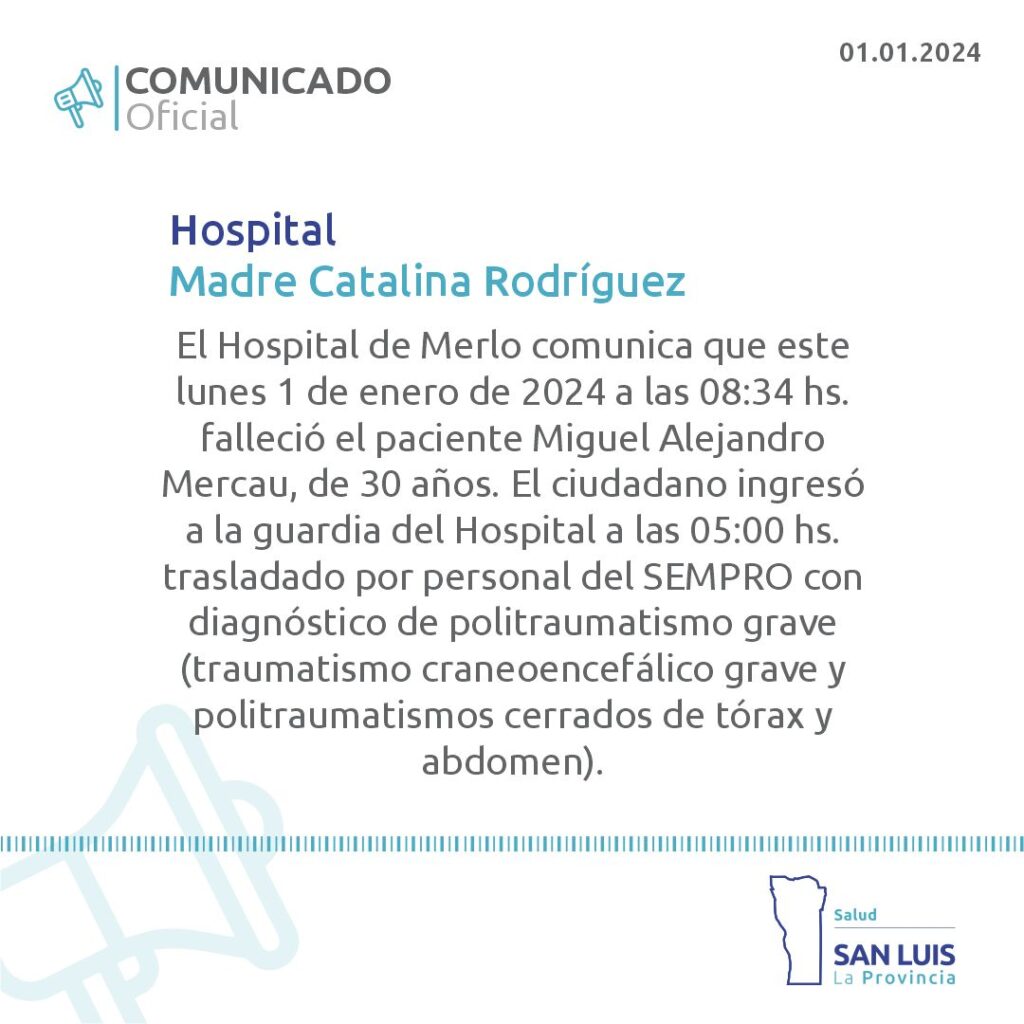 Ocurrió en la Villa de Merlo durante la madrugada del 1 de enero. Fue asistido y trasladado al hospital, pero no pudieron salvar su vida por los golpes que recibió por el impacto.