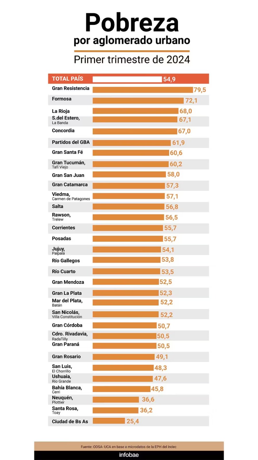 Los datos destacan que el 55 % de la población está en pobreza. Las tasas por aglomerado urbano van desde 80% en el “Gran Resistencia” a 25% en CABA. Siete de cada diez niños viven en hogares pobres. Son niveles que exceden las estimaciones previas.