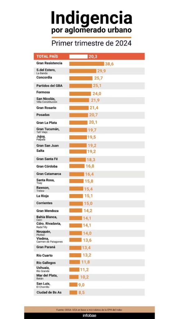 Con los datos oficiales del Indec, y por aglomerado urbano, las estimaciones de la UCA ubican a la región de Gran Resistencia, Chaco, como la más pobre del país con una tasa del 79,5%. La indigencia alcanza al 38,6% de la población. Le sigue Formosa con un 72% de pobres y Santiago del Estero- La Banda con casi 30% de indigentes. Pero la mayoría de las regiones tienen niveles de pobreza por encima del 50% y del 15%, en el caso de la indigencia.