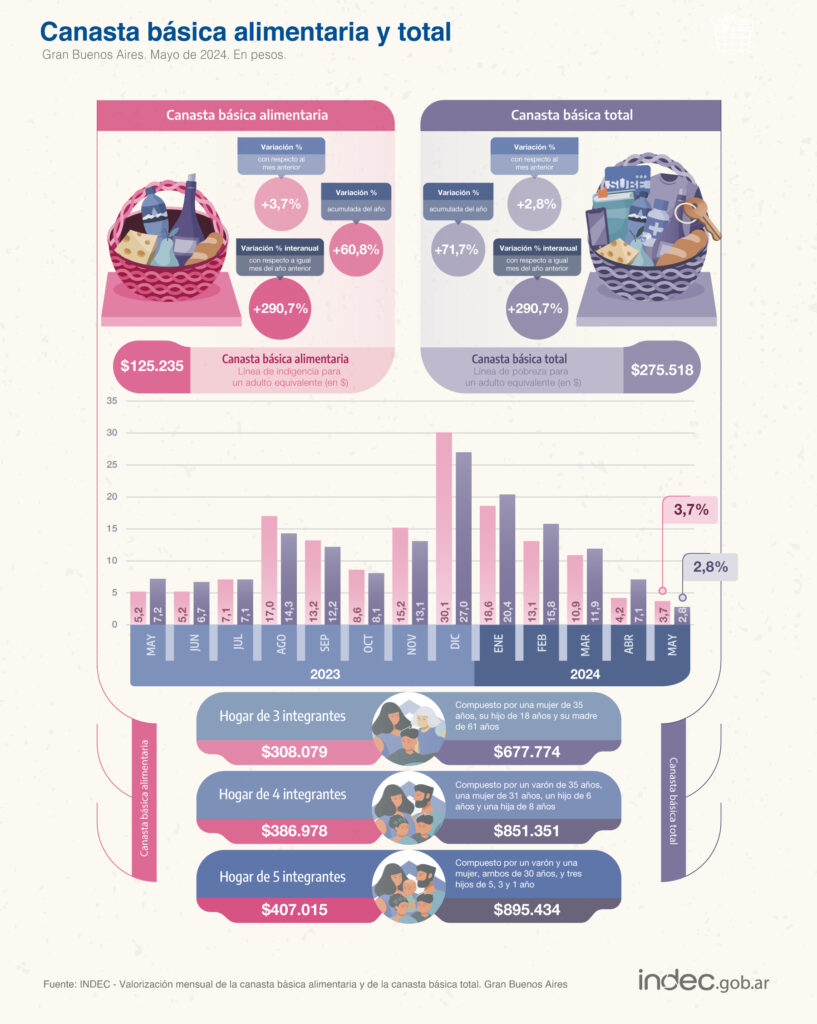 Durante mayo de 2024, la variación mensual de la canasta básica alimentaria (CBA) fue de 3,7%, mientras que la de la canasta básica total (CBT) fue de 2,8%. Ambas por debajo de la inflación de 4,2% que se conoció esta tarde.