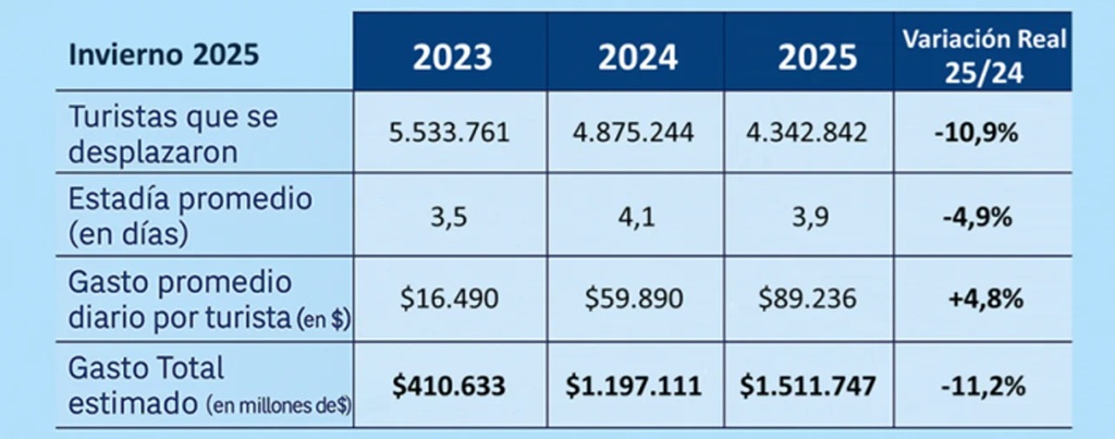 El movimiento en el receso invernal por las ciudades que integran el circuito turístico nacional fue un 10,9% menor que en 2024 y el impacto económico fue un 11,2% menor a 2024, medido a precios constantes, al totalizar $1,5 billones.