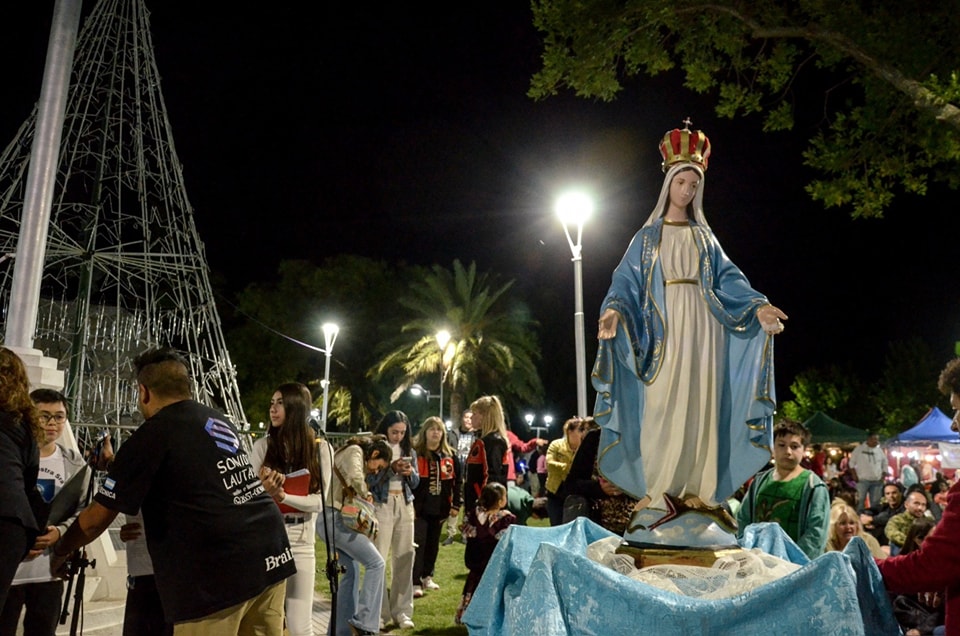 Un rato antes se desarrolló la Santa Misa en honor a la Virgen de la Medalla Milagrosa en la Iglesia Sagrado Corazón y luego se realizó una emotiva procesión que llegó hasta la plaza para el encendido del Árbol.