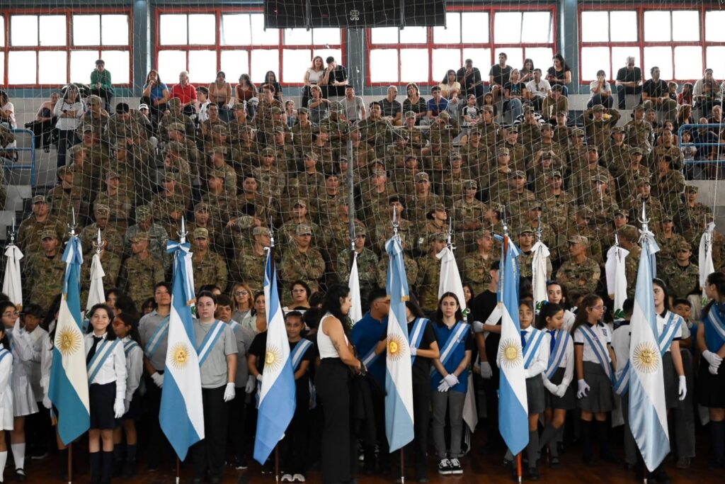 El intendente Maxi Frontera acompañó la ceremonia central, que inicialmente estaba prevista en la Plazoleta Brigada Heroica, pero que debió trasladarse al Palacio de los Deportes debido a las condiciones climáticas.