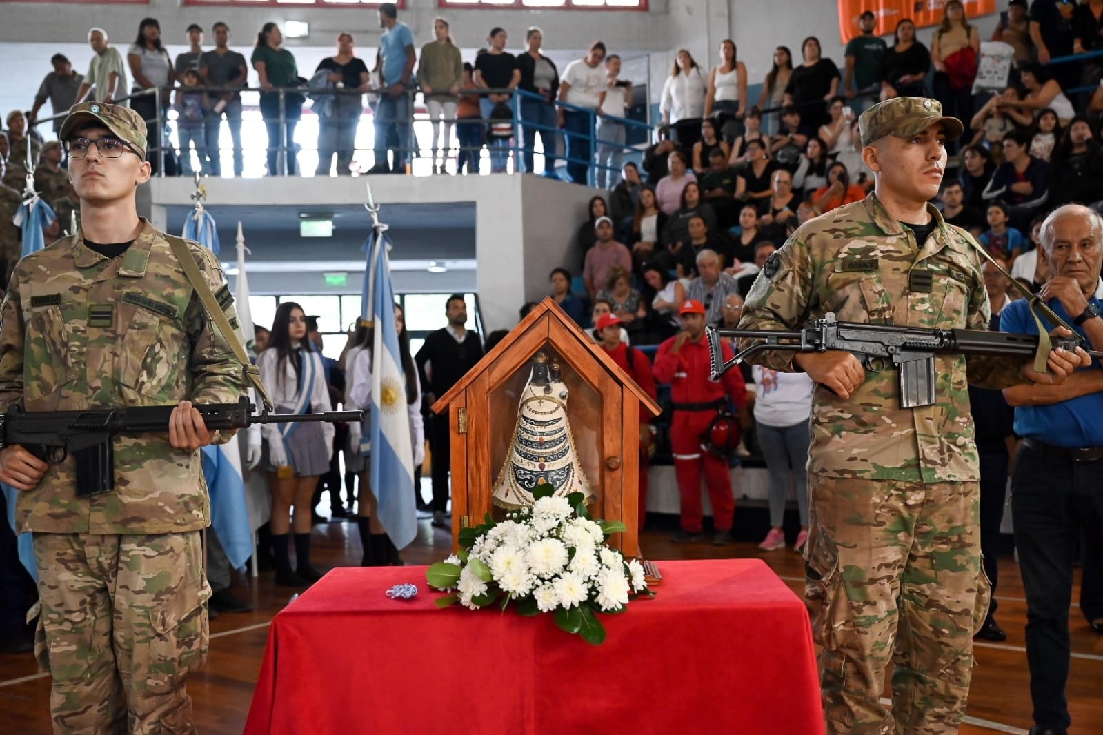 La ceremonia se desarrolló en un clima de profundo respeto y emoción, e incluyó el tradicional desfile de las instituciones presentes. La jornada también contó con la música de la banda de la V Brigada Aérea y la presencia de la imagen de la Virgen, que acompañó el homenaje a los héroes de Malvinas.