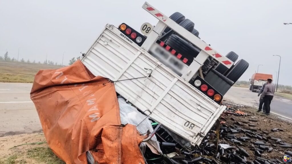 En ese sector, un hombre de 36 años que conducía un camión Scania con semirremolque -transportando botellas vacías- perdió el control del rodado y volcó sobre la banquina, quedando el camión sobre su costado izquierdo.