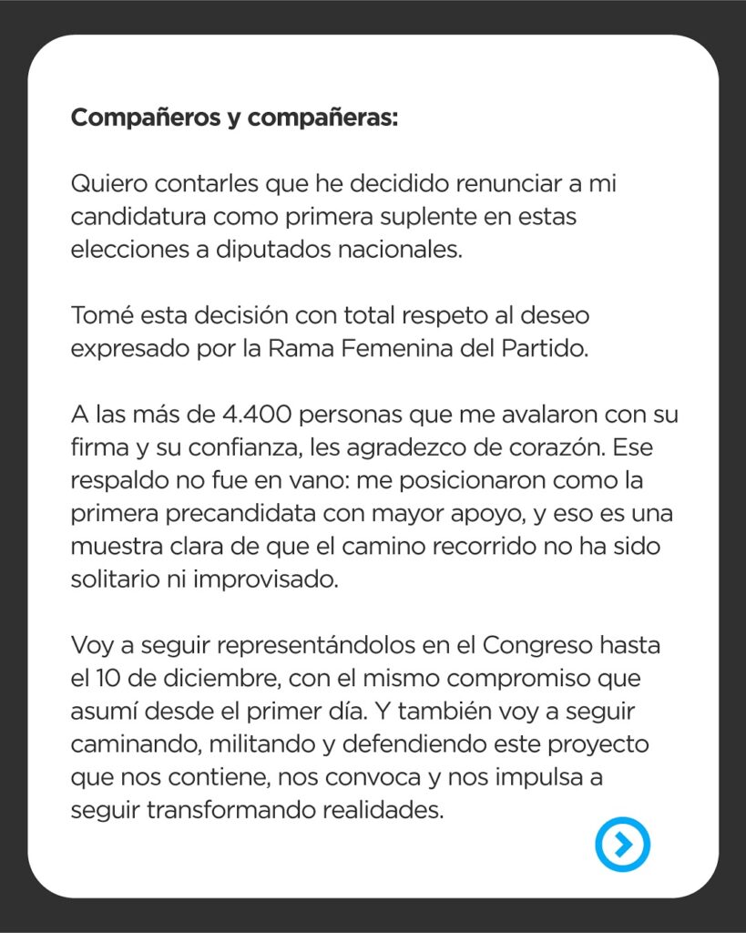 La ahora ex candidata tomó la noticia como un destrato a su militancia dentro del sector y, sin medias tintas, pegó el portazo. La decisión, según trascendió, habría estado motivada por su enojo tras quedar relegada de un espacio que consideraba propio por trayectoria y lealtad.