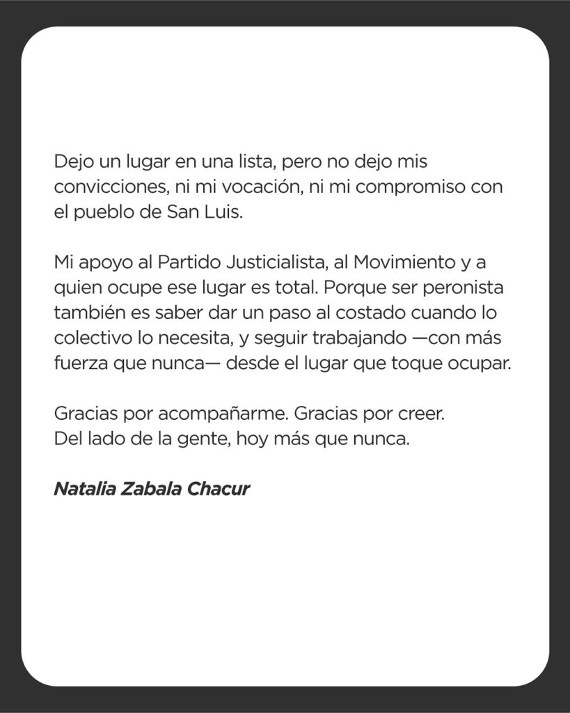 En las últimas horas se conoció la decisión de Natalia Zabala Chacur, diputada nacional y exfuncionaria clave de la gestión de Alberto Rodríguez Saá, de renunciar a su candidatura como primera suplente a diputada nacional dentro de la lista impulsada por el propio exgobernador. La novedad sacudió el tablero político del albertismo y expuso las tensiones internas en lo que alguna vez se vendió como una «lista de unidad».